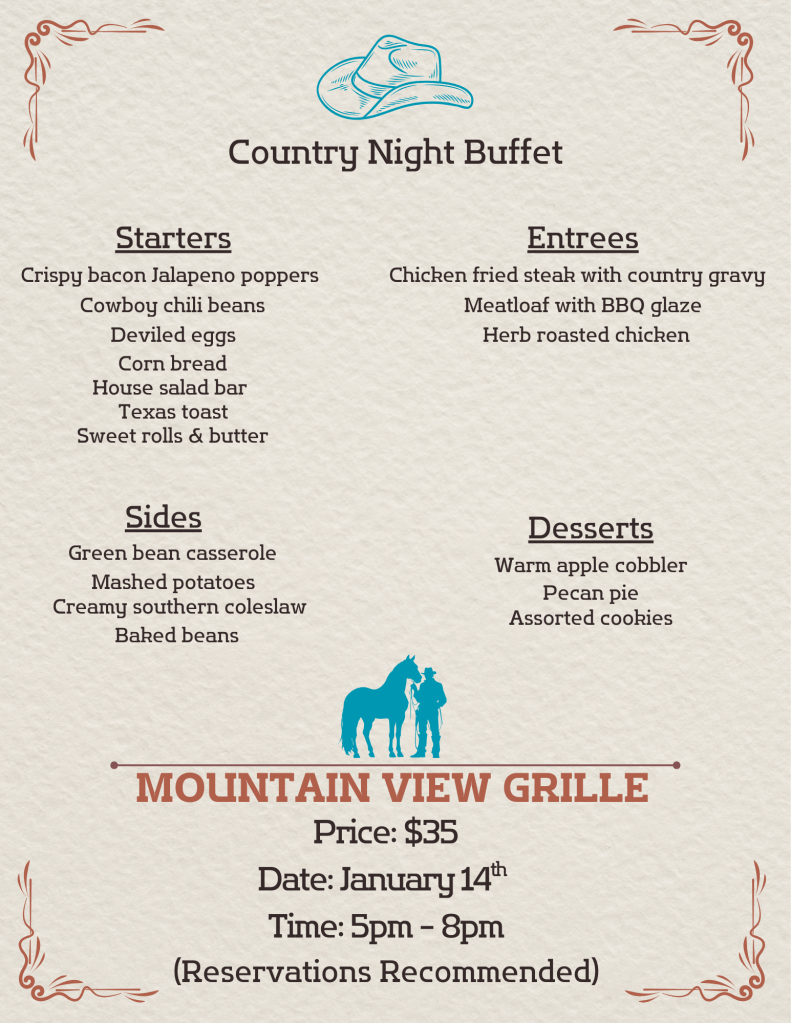 We invite you to join us at the Mountain View Grille for a relaxed and memorable Country Night Buffet. Settle in with friends and neighbors and enjoy a delicious selection of country-inspired comfort favorites. Whether youβre coming for the comfort cuisine or the friendly mountain-view setting, we look forward to welcoming you for a night of warm hospitality and hearty flavors. π€ π½οΈ