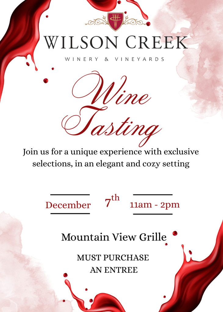 Join us for a warm and inviting afternoon at the Mountain View Grille as we showcase an exclusive selection of wines from Wilson Creek Winery. Enjoy a curated tasting experience featuring some of their most celebrated varietals—each chosen to highlight the signature character and craftsmanship the winery is known for.